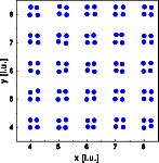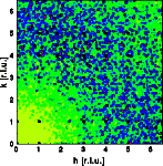 The first example shows the effect of thermal disorder. The crystal consists of square molecules in a primitive cubic lattice. The each atom is displaced independently at random. The direction of displacement is isotropic, the amplitude of the displacement is Gaussian distributed according to the thermal parameter. The left image shows a part of the crystal, 30*30 unit cells were used for the calculation. The right image shows one quadrant of reciprocal space.