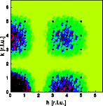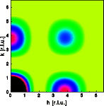 ![]() ![]() ![]() The Bragg reflections are shown as black dots, most of them are overexposed. Diffuse scattering results that is modulated in reciprocal space since the atoms are no longer replaced independently. Note that the diffuse scattering is more intense at shorter reciprocal vectors h. The modulation of the diffuse scattering can be explained by calculating the Fourier transform of a single rigid square molecule (right image above). This Fourier transform shows the same modulation as that of the diffuse scattering observed from the disordered crystal. In real space randomly occupied and empty points on a cubic primitive lattice are convoluted with the molecule. In reciprocal space the monotonous Laue scattering is multiplied by the Fourier transform of a single molecule. Since the monotonous Laue scattering is strongest near the origin of reciprocal space, the diffuse scattering of this crystal is strongest at the origin of reciprocal space as well. |