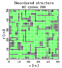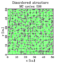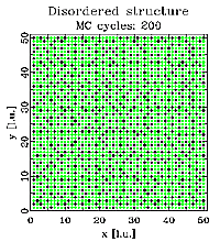 The figures below show three different vacancy ordering distributions. In all cases the size of the simulated crystal is 50x50 unit cells with one atom (shown as green dots) per unit cell. The crystal contains 30% vacancies shown in black. The left figure shows a random distribution. The middle figure corresponds to a positive nearest neighbor correlation. The tendency to have like neighbors along the x and y direction forms the chains of vacancies. Finally the right figure shows a structure with a negative nearest neighbor correlation. It can clearly be seen that the structure contains no vacancy nearest neighbors. Again, you might click on the figures for an enlarged view.