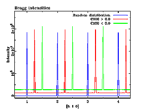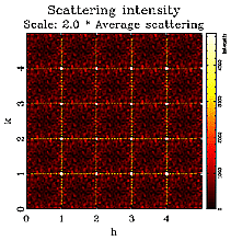 ![]() The first sum is over all chemical species, e.g. AA, AB and BB and the second sum is over all neighboring vectors r(lmn). The values alpha are the correlations, c(i) concentrations of atom type i and f(i) the scattering power of atom type i. Try simplifying the expression for vacancies (f=0) and derive the expression for a random distribution. In that case a uniform diffuse scattering is found. What can be seen from the expression, that every non-zero correlation contributes a cosine and the diffuse scattering is simply a sum of those cosines which we simulated way back in assignment two. Even without mathematics, some information can be taken from simple inspection of the scattering pattern. A positive correlation a100 for example creates diffuse streaks through the Bragg peaks parallel to h and k and a negative a100 will give the same streak between Bragg peaks. It should also be noted that the scattering intensity is symmetric around the Bragg positions. Note that in these examples we refer to a100 as the set of symmetrically equivalent 100 directions.