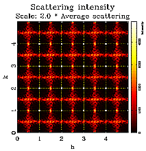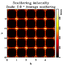 ![]() ![]() ![]() The structures shown above were created via Monte Carlo (MC) simulations using the program DISCUS. A detailed description of the simulation technique is beyond the scope of this tutorial, interested readers might refer to the DISCUS users guide for details. Next we look at the corresponding neutron diffraction patterns shown below. One quadrant of reciprocal space is shown, units are reciprocal lattice units (see basic examples). The left image show the pattern for the random vacancy distribution. The diffuse scattering is essentially uniform (the remaining 'noise' is due to the limited size of the simulation). The middle figure corresponds to the structure having a positive nearest neighbor correlation. We can observe diffuse streaks running through the Bragg positions at integer h and k. The structure with the vacancy ordering showing a negative correlation produces the diffraction pattern shown in the right figure. In this case we observer diffuse streaks intersecting half way between Bragg peak positions.