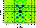 ![]() ![]() Comparison of the Fourier transform of the original unit cell (left image) with the Fourier transform of the expanded unit cell (right image) shows that the overall shape of the intensity distribution remains the same while the reciprocal space dimensions have shrunk 10 %. Get a full screen version by clicking on the images below. The combined plot of the Fourier transform of the unit cell and the Bragg reflections (blue circles)shows that the positions of the Bragg reflections have changed accordingly. They too have shifted closer to the reciprocal space origin.