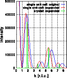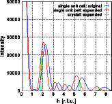 ![]() ![]() The one-dimensional scans do show this phenomenon even more clearly. The new Fourier transform (red curve) is contracted by 10 % compared to the original Fourier transform (blue curve). The scattering intensities of the expanded crystal are shown in green.
