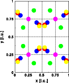 The projection of the structure along [001] in the left image shows the original structure, while the right image shows the modified structure. Note that the distance of all atoms have been increased by a factor of 1.1. The grid gives 0.25 intervalls in fractional coordinates. The origin of the unit cell is at the lower left corner, the horizontal axis is [100], the vertical axis [010].