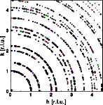 ![]() ![]() The next set of images shows a 'powder' composed from 4 single crystals in random orientation (left) and the corresponding diffraction pattern (middle). The individual diffraction patterns plotted in the same color as the corresponding crystal start to add up to rings of reflections. With just four reflection its difficult though to recognize the rings. The right image shows a diffraction pattern of 40 single crystal grains (black). The colored spots are the peaks from the 4 grain 'powder' shown in the middle image. Now the powder rings are clearly visible. To get a larger picture just click on the corresponding image.